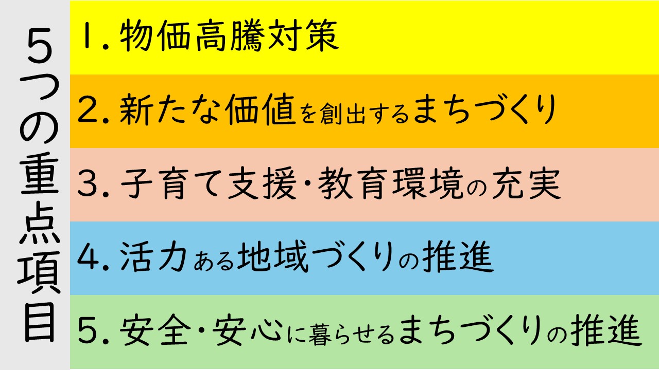 令和8年度予算では、次の5つの重点項目をもとに、市民満足度を高めるきめ細やかな施策を展開します。