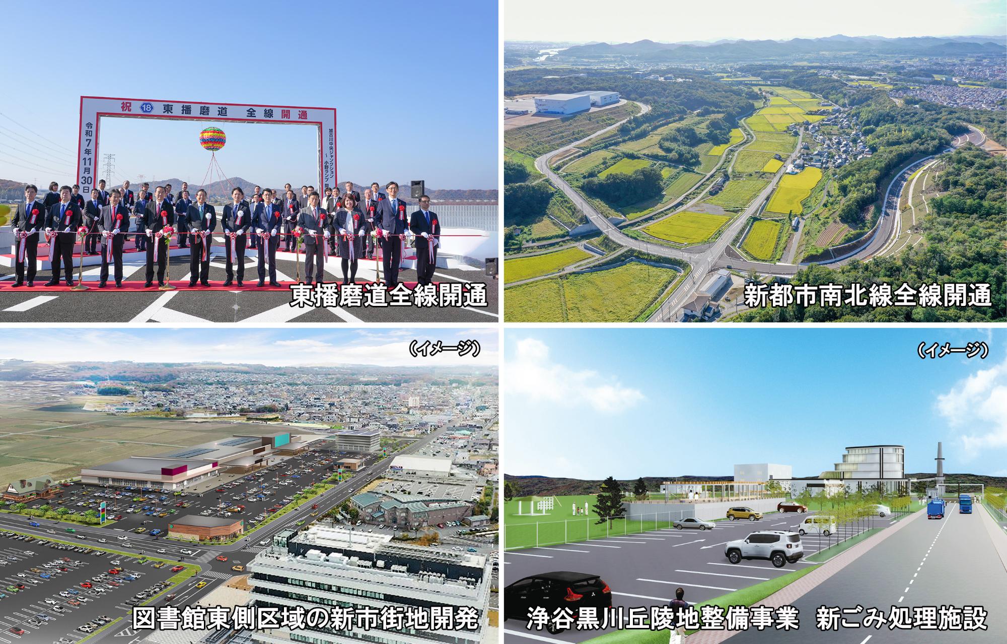 昨年11月には、就任時からの大きなプロジェクトであった東播磨道が全線開通いたしました。この道路は、県立加古川医療センター、加古川中央市民病院、北播磨総合医療センターを結ぶ「命の道」であり、災害時の「安全安心の確保」、臨海部と内陸部の連携強化による「雇用創出」や「定住促進による少子化対策」につながるものです。また、新たなまちづくり構想として、都市機能が集積するシビックゾーンと一体となる「図書館東地区市街地開発事業」や「大型商業施設の開業」、「浄谷黒川丘陵地整備事業」など、本市の更なる発展の基盤づくりを官民連携により積極的に進めております。