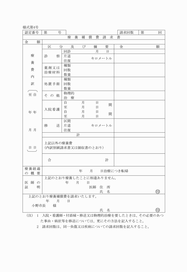 第3条 療養補償費の給付を受けようとするときは、療養補償費請求書(様式第4号)を市長に提出しなければならない。