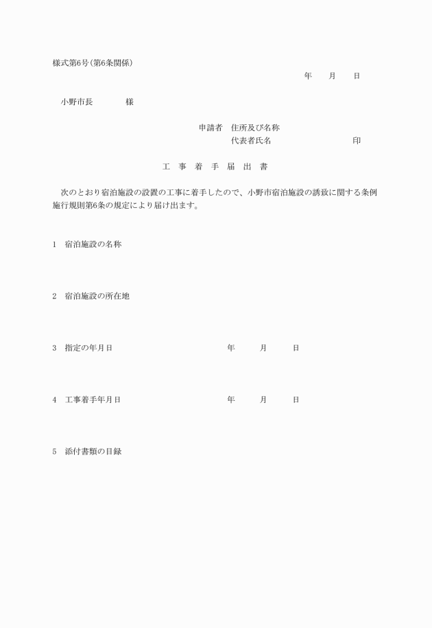 第6条 指定企業は、宿泊施設を設置する工事(以下「工事」という。)に着手したときは、遅滞なく工事着手届出書(様式第6号)を市長に提出しなければならない。