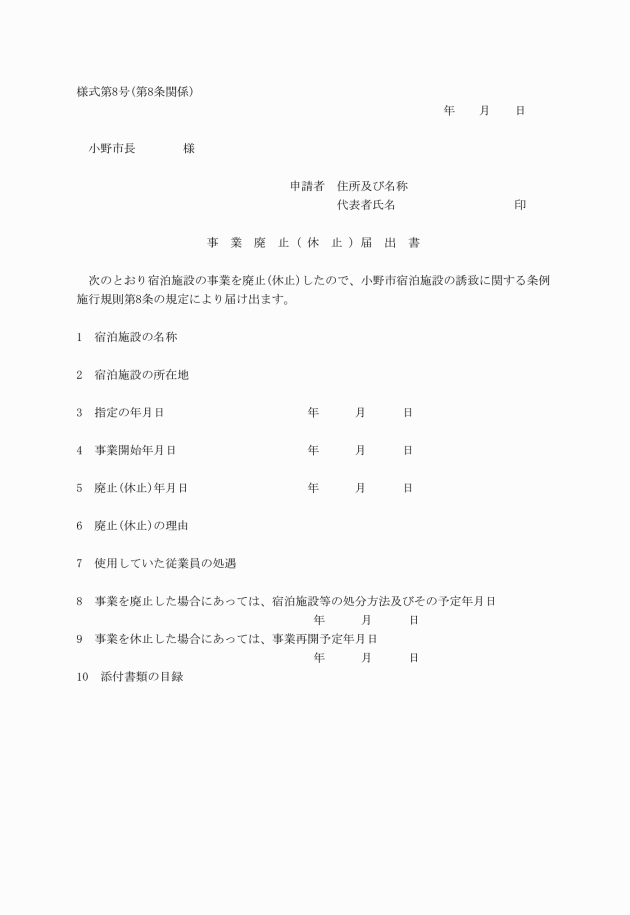 第8条 指定企業は、事業の全部を廃止し、又は休止したときは、遅滞なく事業廃止(休止)届出書(様式第8号)を市長に提出しなければならない。