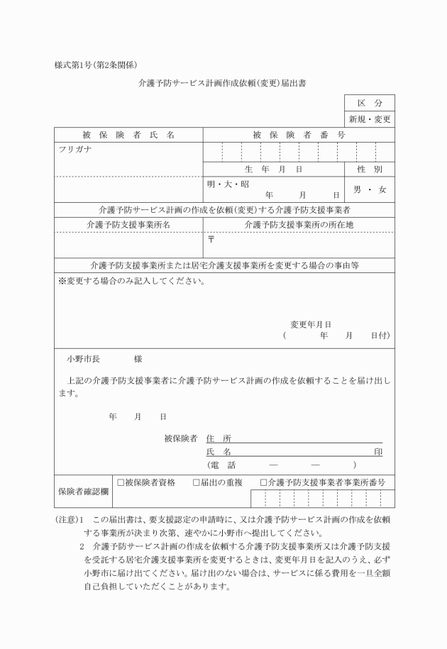 第2条 居宅要支援被保険者は、基準該当介護予防支援を受けようとするときは、あらかじめ市へ介護予防サービス計画作成依頼(変更)届出書(様式第1号)により届け出なければならない。