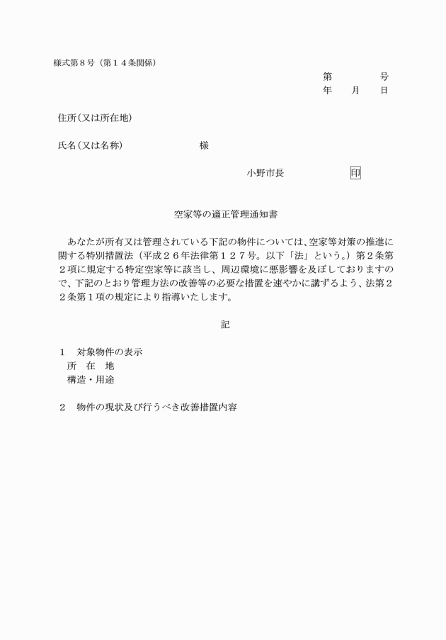 第15条 市長は、法第13条第2項の規定による勧告を行おうとする場合は、空家等の適正管理勧告書(様式第9号)により行うものとする。