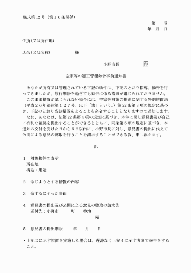 3 市長は、法第22条第4項の規定による通知を行おうとする場合は、空家等の適正管理命令事前通知書(様式第12号)により行うものとする。
