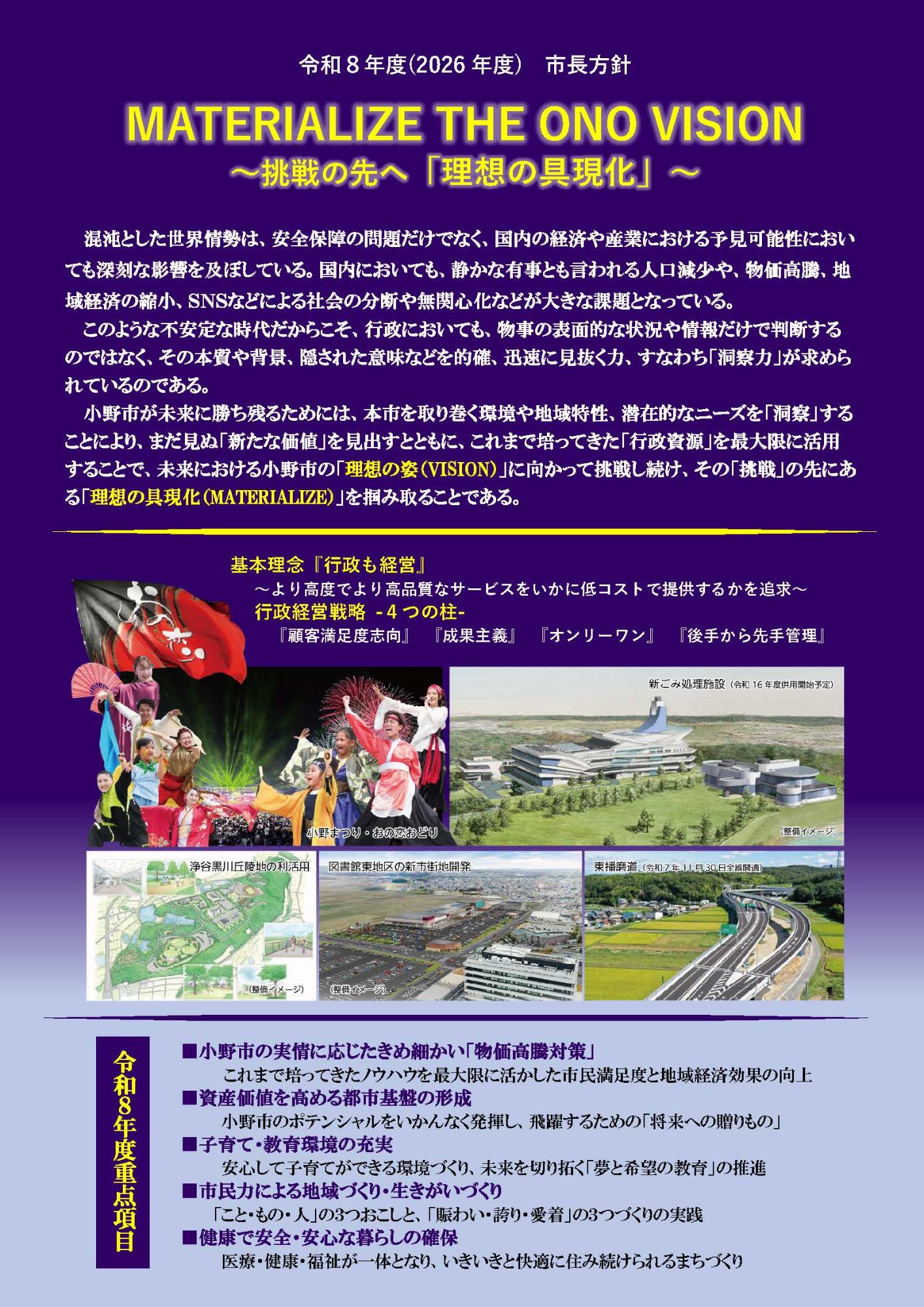 令和8年度の市長方針は、MATERIALIZE THE ONO VISION~挑戦の先へ「理想の具現化」~であります。小野市が未来に勝ち残るためには、本市を取り巻く環境や地域特性、潜在的なニーズを「洞察」することにより、まだ見ぬ「新たな価値」を見出すとともに、これまで培ってきた「行政資源」を最大限に活用することで、未来における小野市の「理想の姿(VISION)」に向かって挑戦し続け、その「挑戦」の先にある「理想の具現化(MATERIALIZE)」を掴み取ることであります。