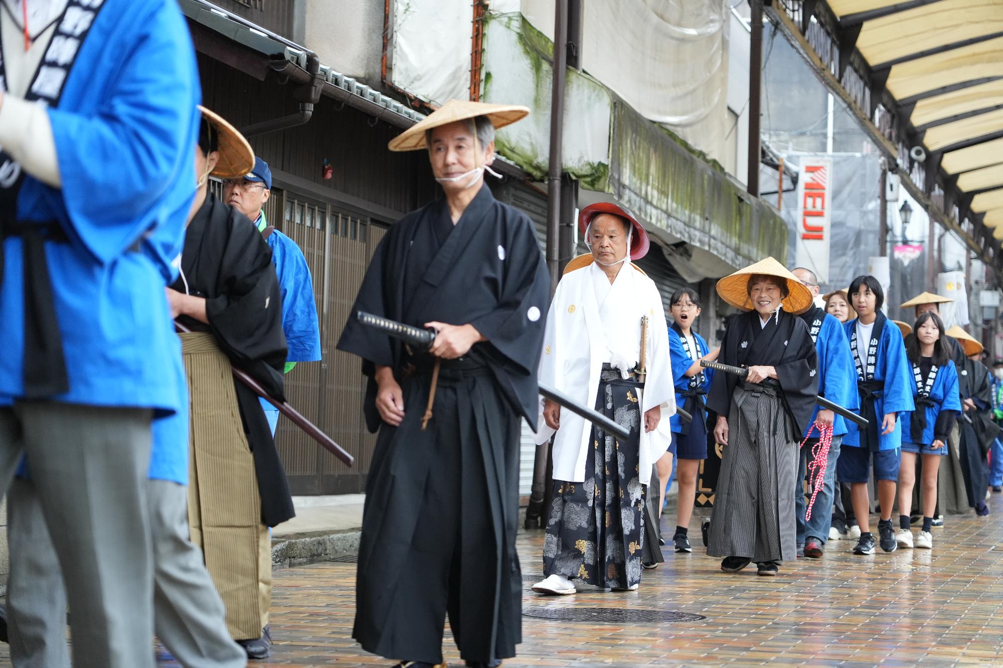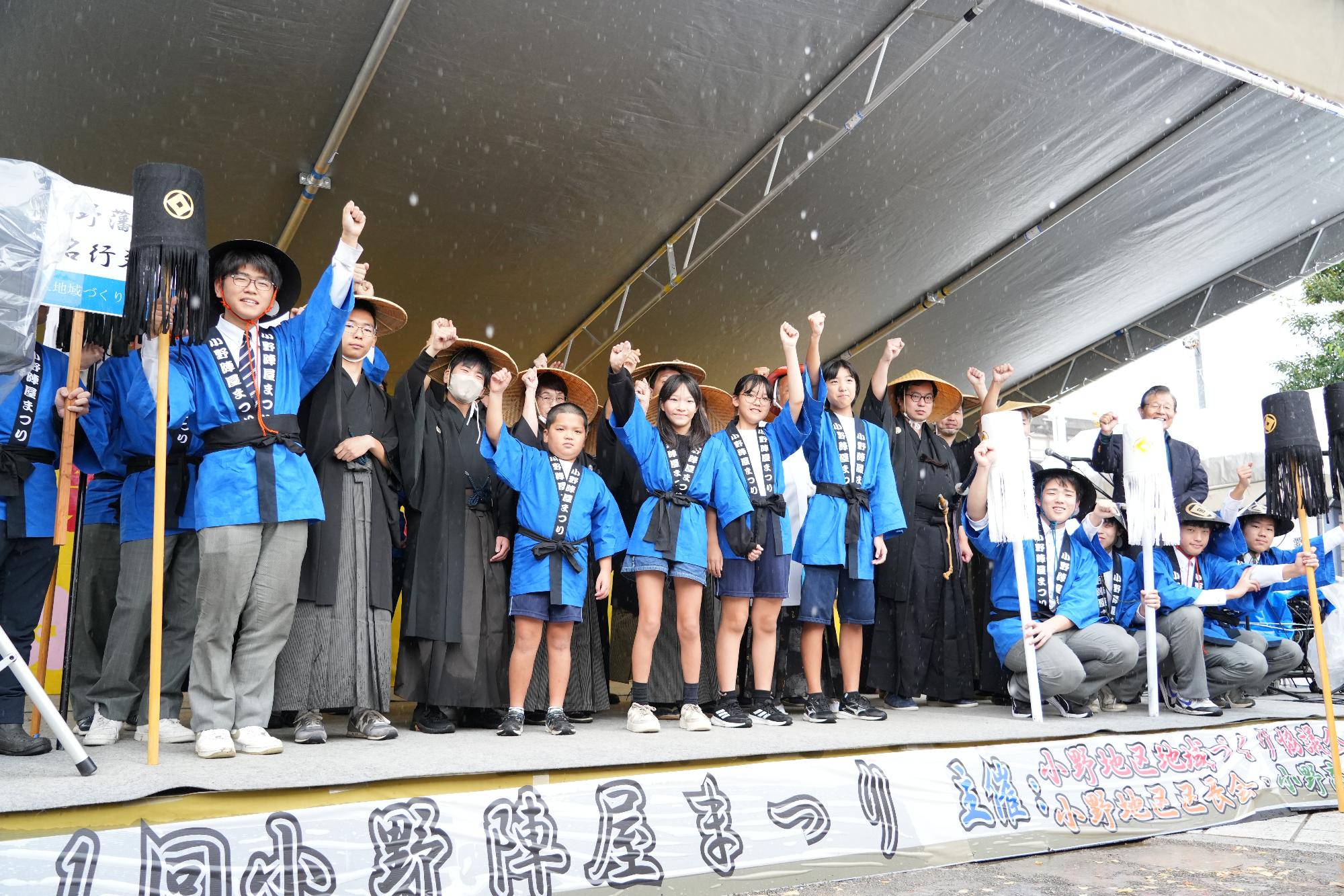 当日はあいにくの雨となりましたが、全長800mの長さがある「小野商店街」の中を陣屋まつり恒例の「小野藩大名行列」が紋付はかま姿等で悠然と練り歩きました。参勤交代を再現した約30名からなる行列の大名役には、公募から選ばれた一般市民の方が務め、藩士役等に地域住民や小野工業高校の生徒たちが参加されるなど、太鼓の音に導かれ進む姿は本物さながらであり、壮大でありました。