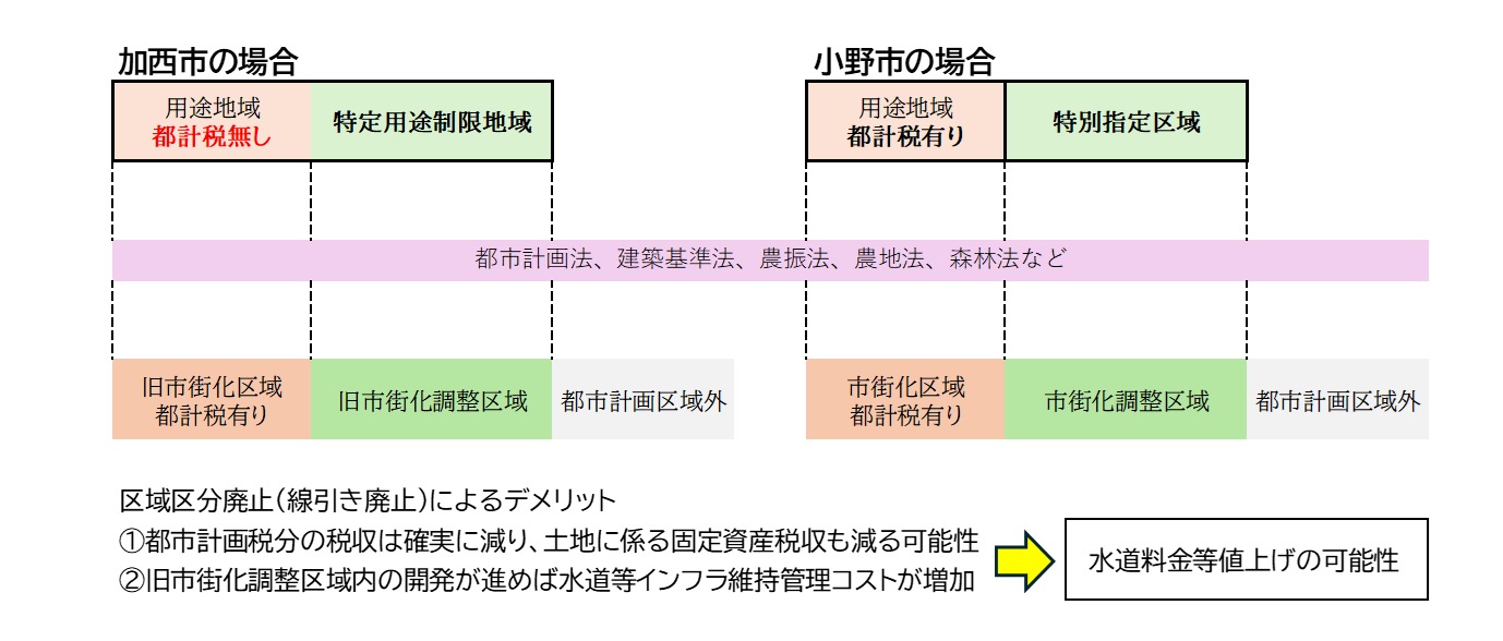 次に、「区域区分」の廃止の影響として「市街化区域」を廃止することで都市計画税をどうするのかという問題も生じます。区域区分を廃止したからと言って、同時に「旧市街化区域」の都市計画税が廃止されるというものではありませんが、区域区分が廃止されているにもかかわらず、従前のとおり「旧市街化区域」に都市計画税を賦課し続けるというのは、住民の納得は得られないでしょう。この点、加西市では、この「区域区分」の廃止を見据えて、令和6年度から都市計画税を廃止されております。小野市の年間都市計画税額は約3億3,000万円ほどですので、この歳入減は、決して軽いものではありません。