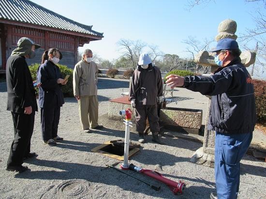 しかし、郷土の文化財を後世へ伝承するため「コロナ禍でもできること」を考え、当本部予防課職員と浄土寺を管理されている方々とで、消防用設備の点検と初期消火訓練を行いました。